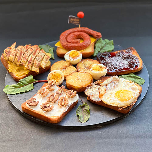 نان تست - تخم مرغ - پنیر گودا - گردو - چوریزو - شنیسل - پوره سیب زمینی - سیب زمینی گریل - مربا